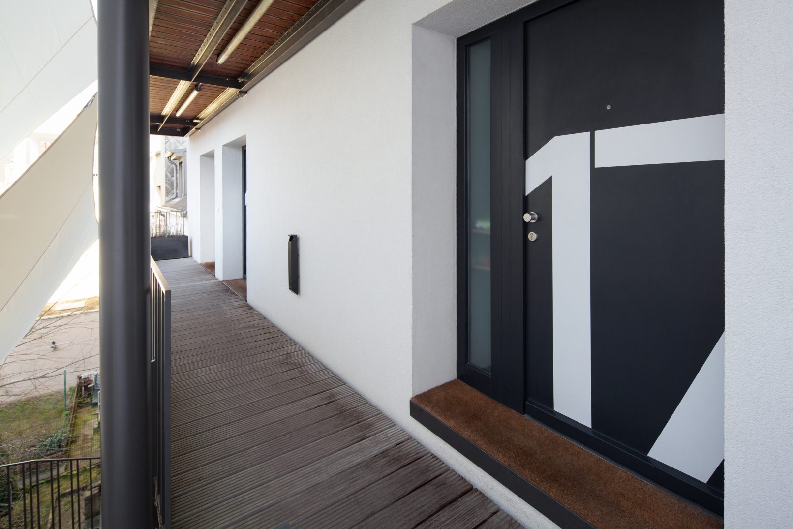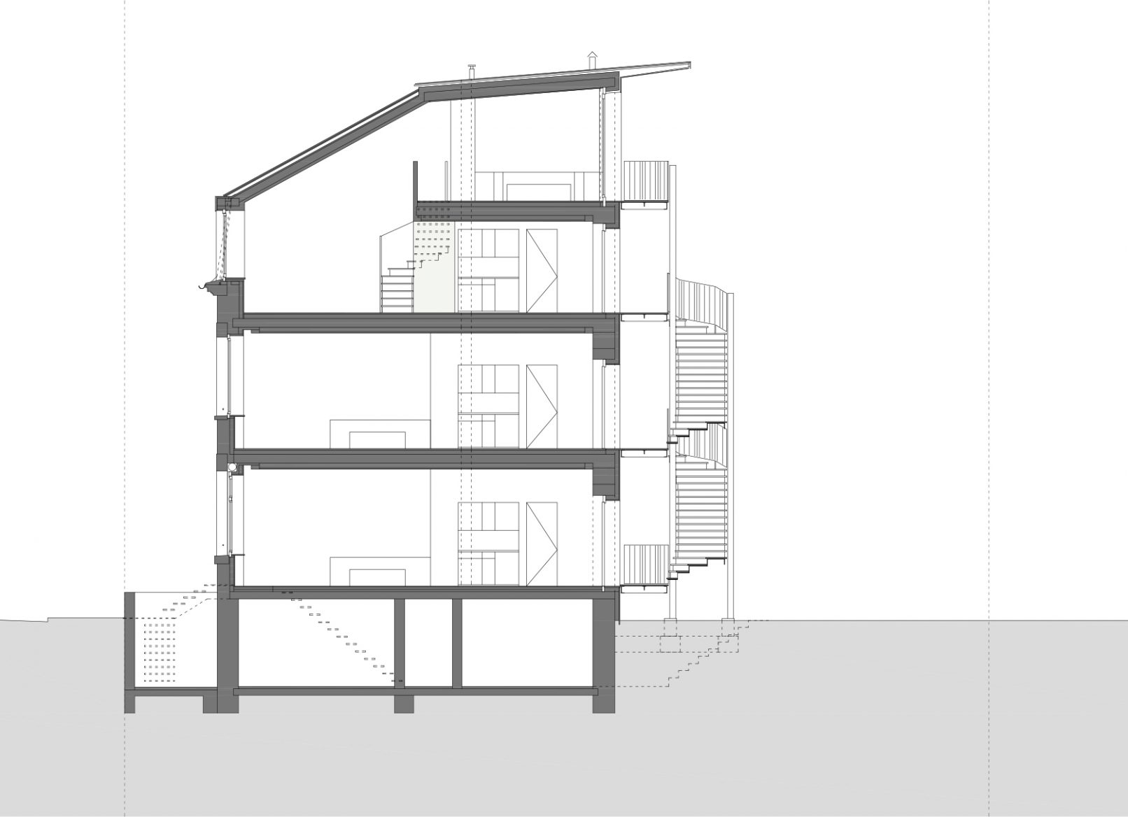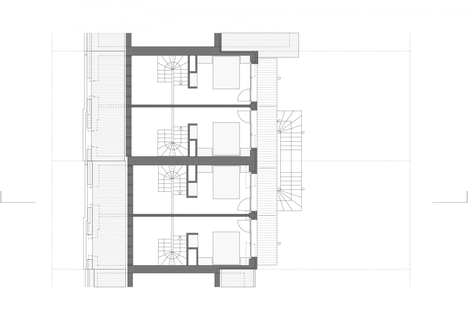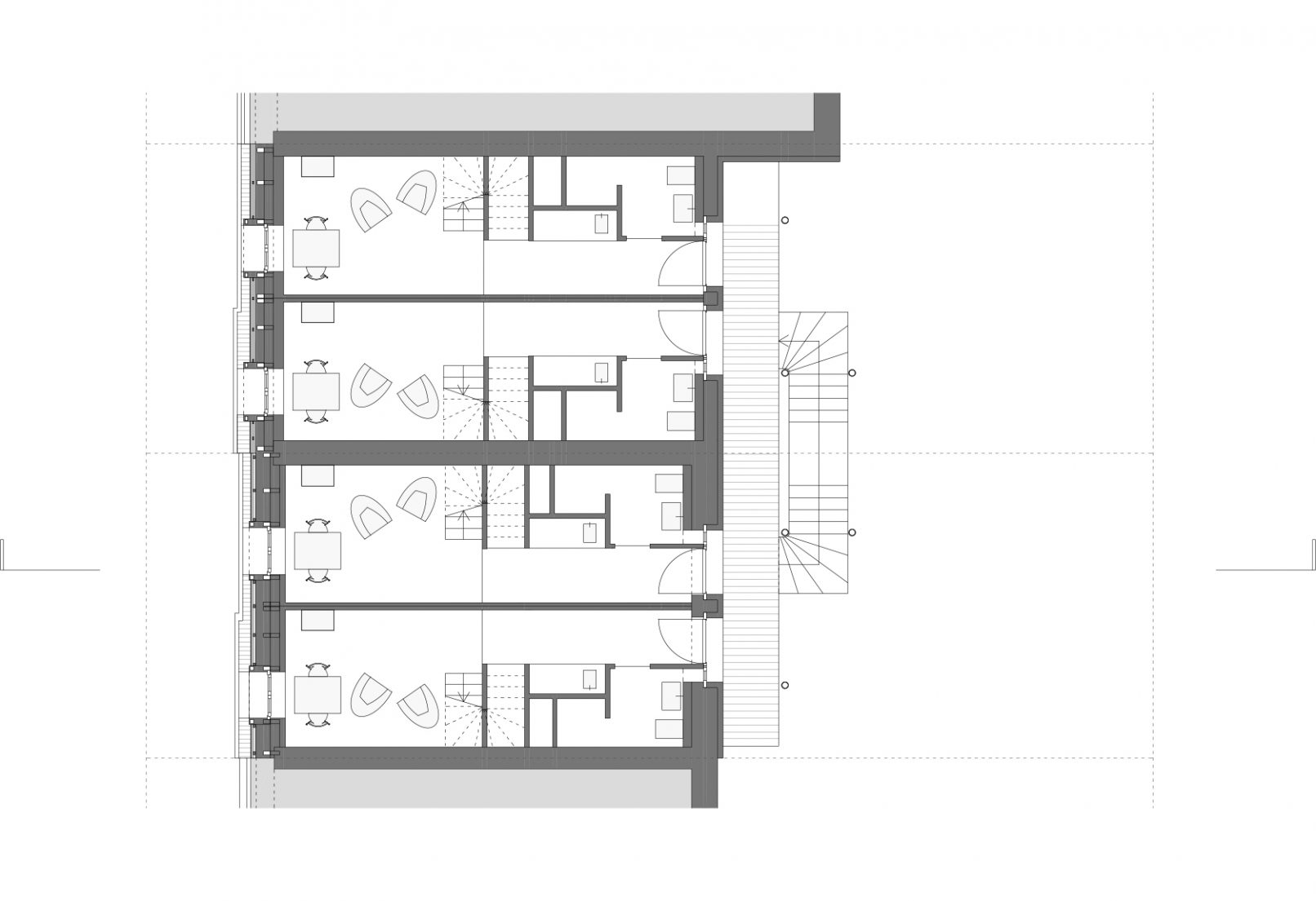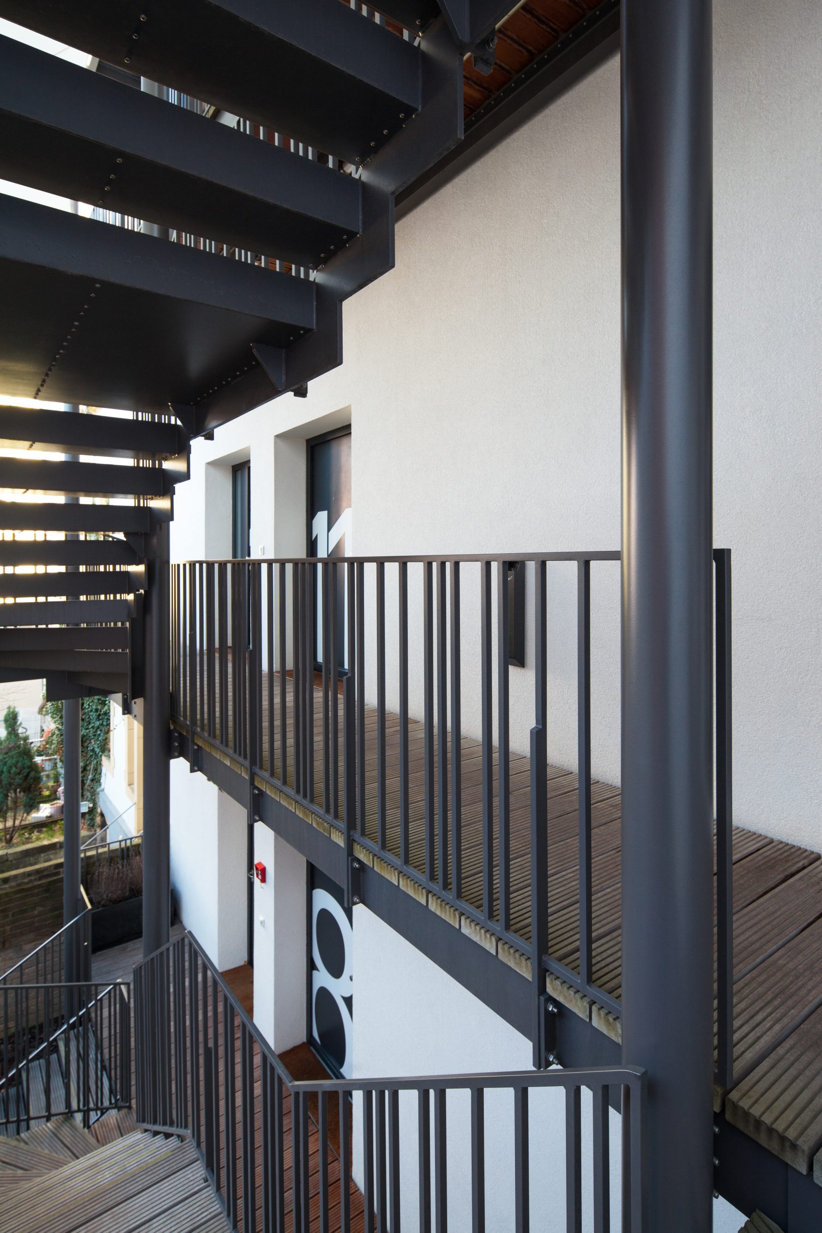 les maisons étant situées dans un ensemble sensible de la ville, les façades côté rue ont été maintenues à l’identique et restaurées. par contre, la façade arrière a été entièrement reconstruite et rehaussée, permettant d’intégrer les logements en duplex. l’accès au différents appartements s’effectue le long de cette façade par une structure métallique avec coursives et escaliers. tous les logements donnent alors sur la rue et répondent ainsi aux prescriptions en matière de sécurité incendie.