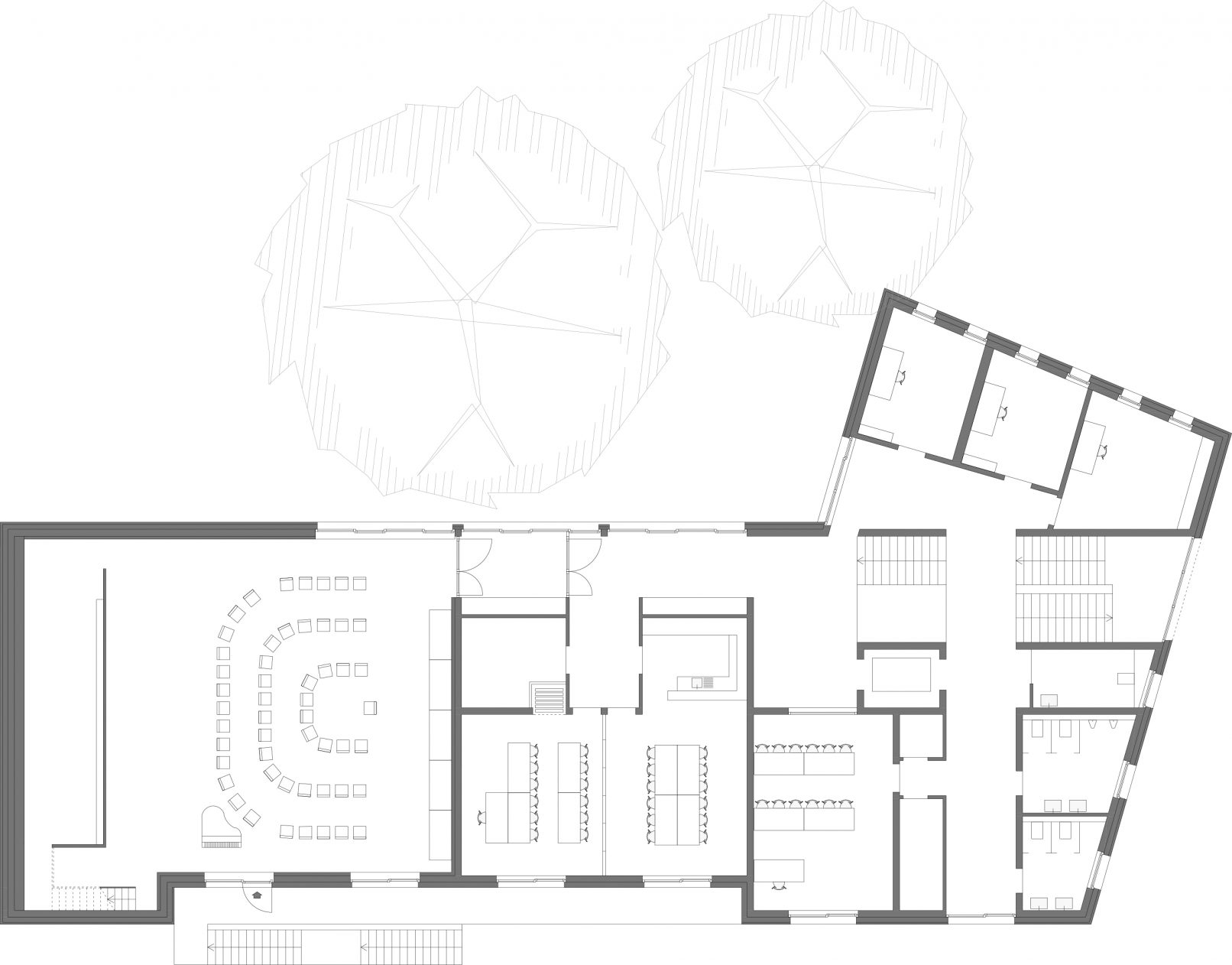 le rez-de-chaussée est principalement dédié à la zone de ‘sauvetage’ des services d’incendie et au stationnement des véhicules. la partie intermédiaire entre le rez et le premier étage laisse place aux espaces de cours de musique et aux installations sanitaires communes. le premier étage accueille la salle de formation divisible en deux ainsi que la salle de répétition qui sont reliés entre eux par une loggia externe. au fond de la salle de répétitions se loge un local de stockage ne couvrant pas l’intégralité de la hauteur sous plafond. ce volume permet d’améliorer l’acoustique de la salle. de plus, sa surface supérieure accessible par un escalier intégré au volume, sert de tribunes lors des représentations publiques.