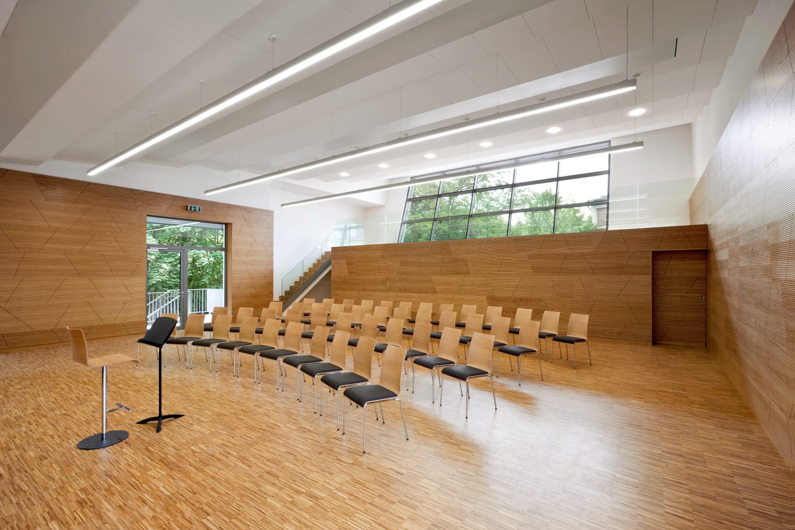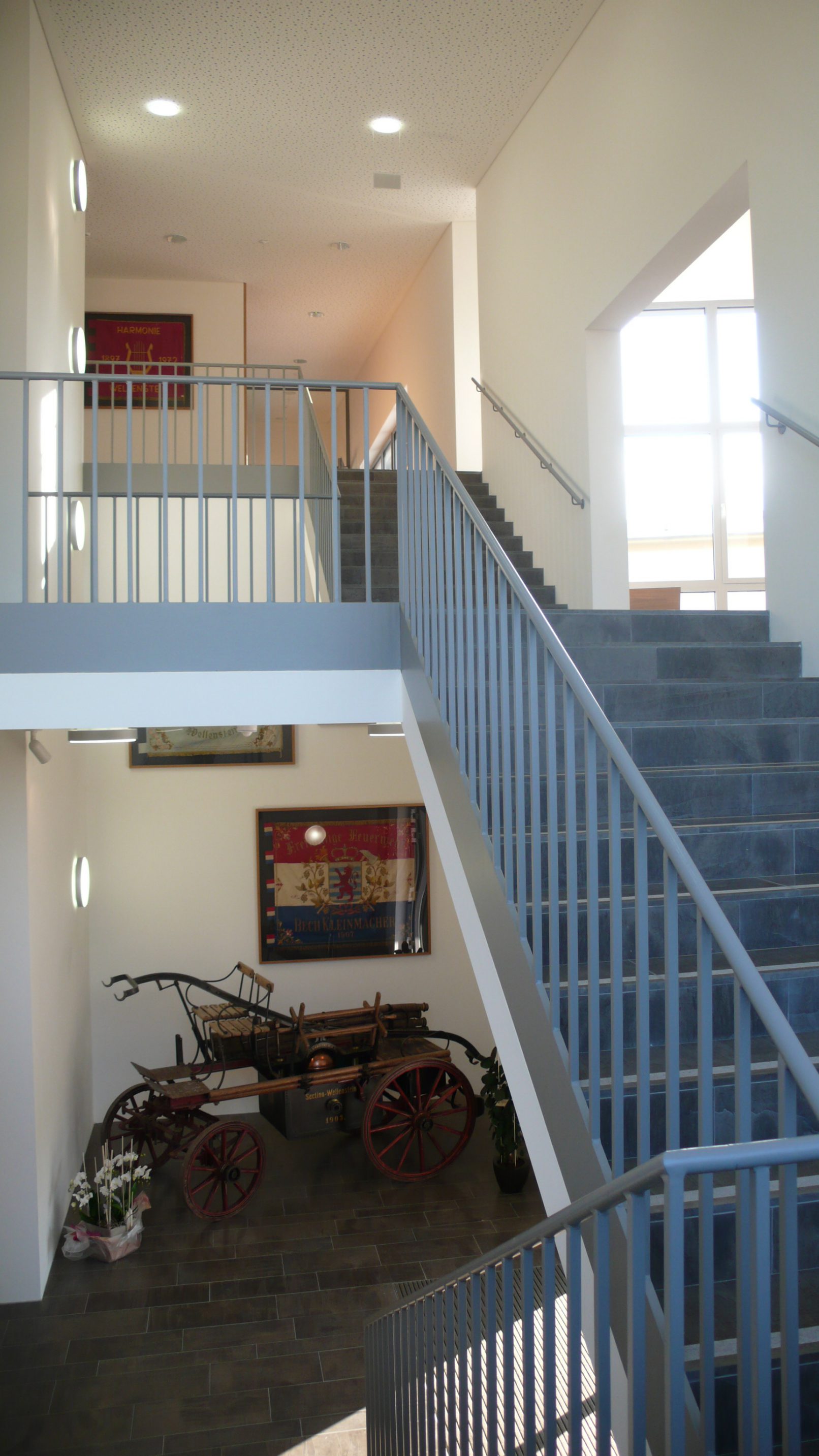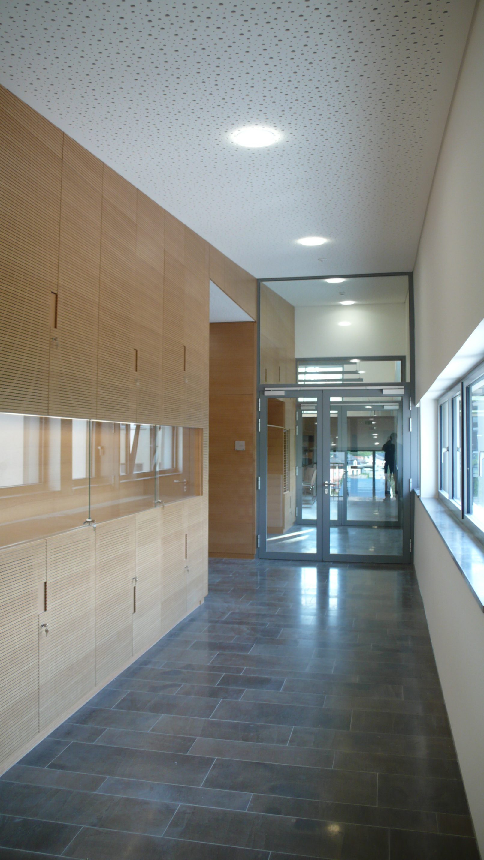 le nouveau bâtiment devait regrouper le centre pour les services d’incendie, une salle de répétition, des salles de cours de musique et un atelier communal. des aménagements extérieurs complètent la conception.