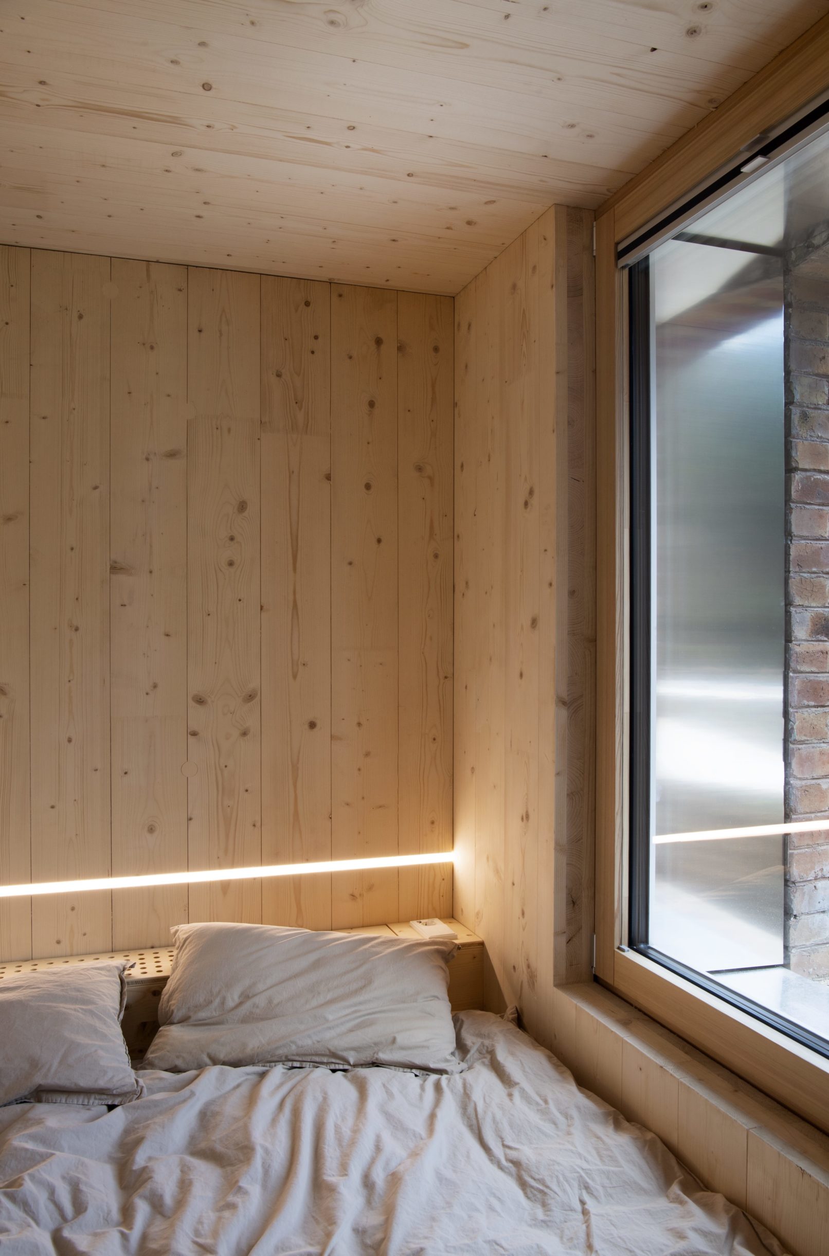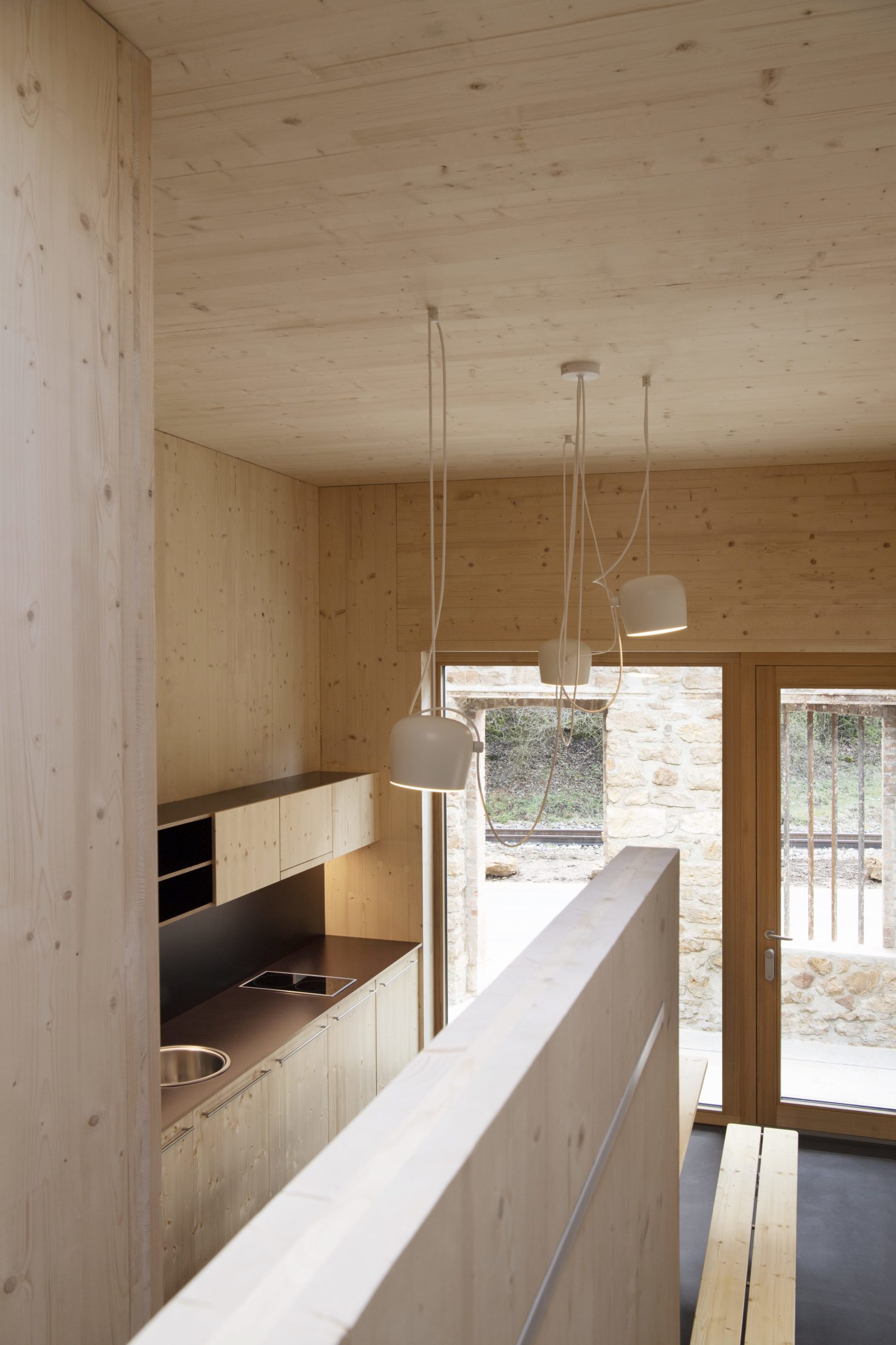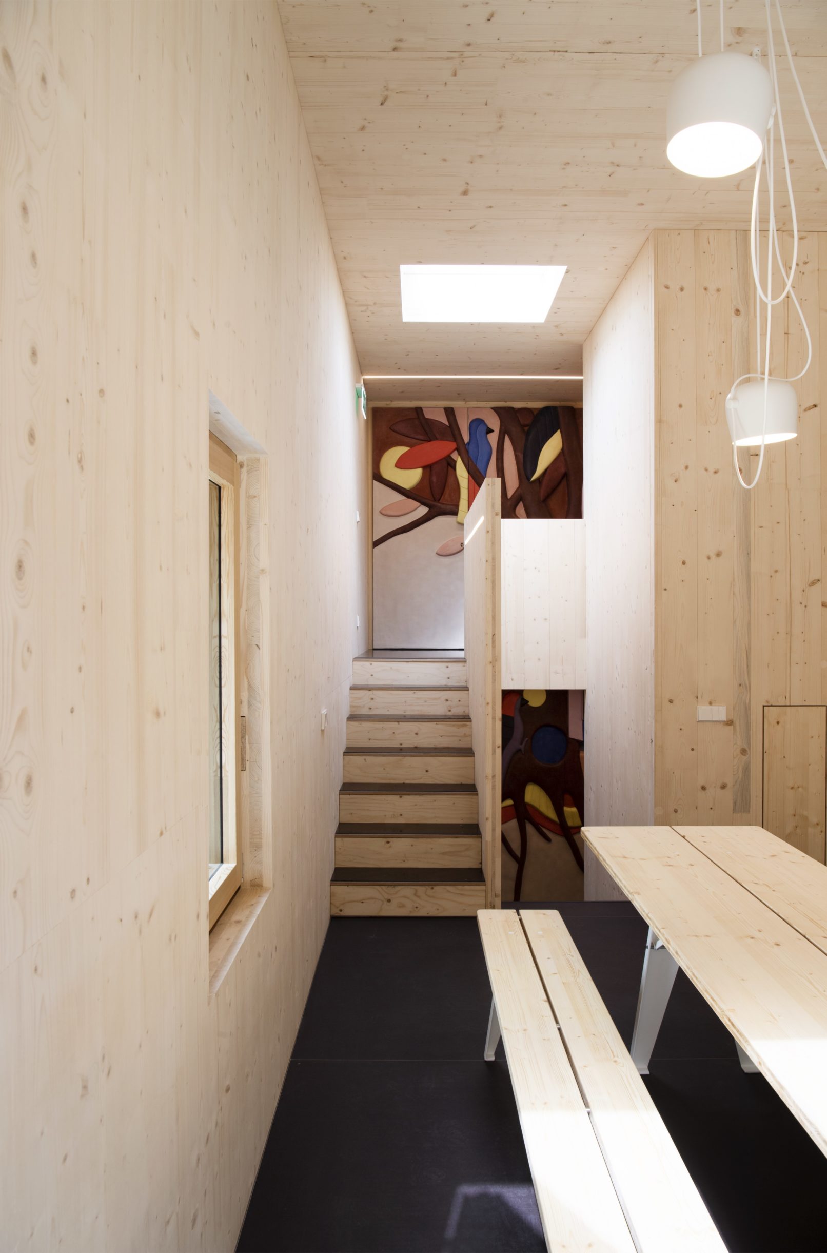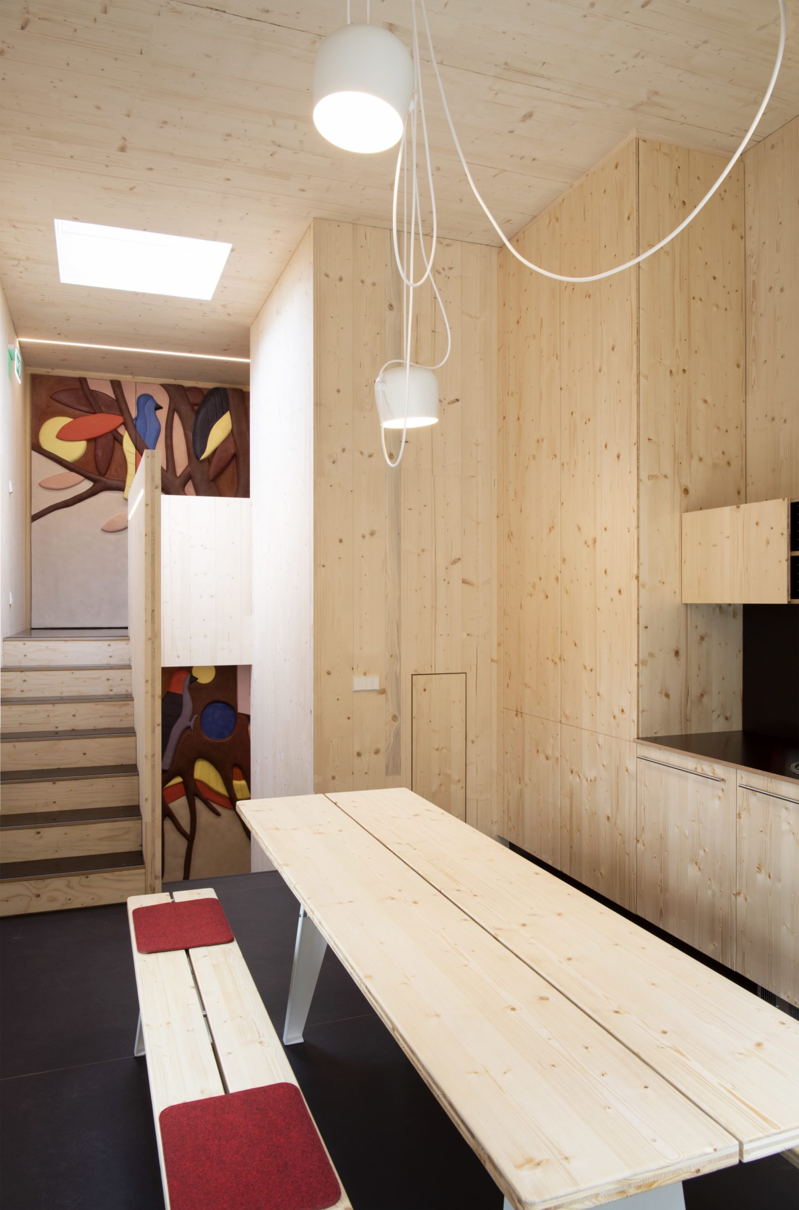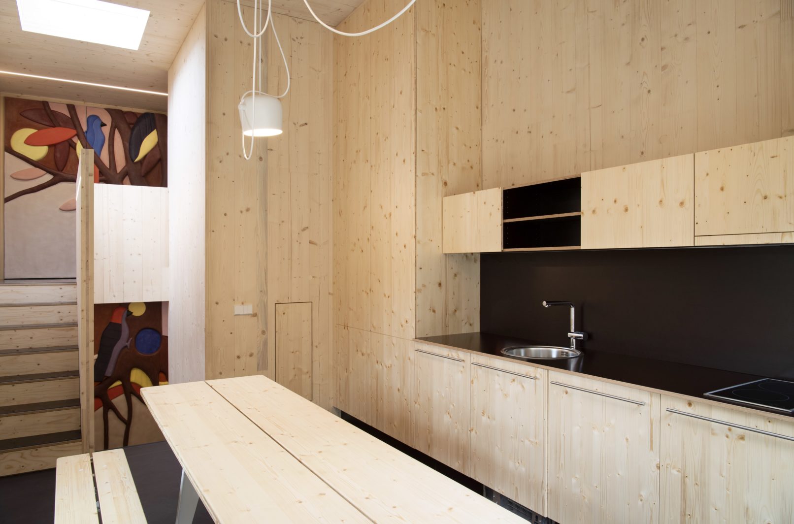après cette étape cruciale, les travaux se sont résumés aux installations techniques ainsi qu’aux travaux de menuiserie et de mobilier intégré. à l’intérieur de la nouvelle boîte, les travaux de finitions ont été réduits au minimum en laissant le bois largement apparent. un autre grand défi a également été l’obtention des différents raccordements techniques dans les délais impartis.