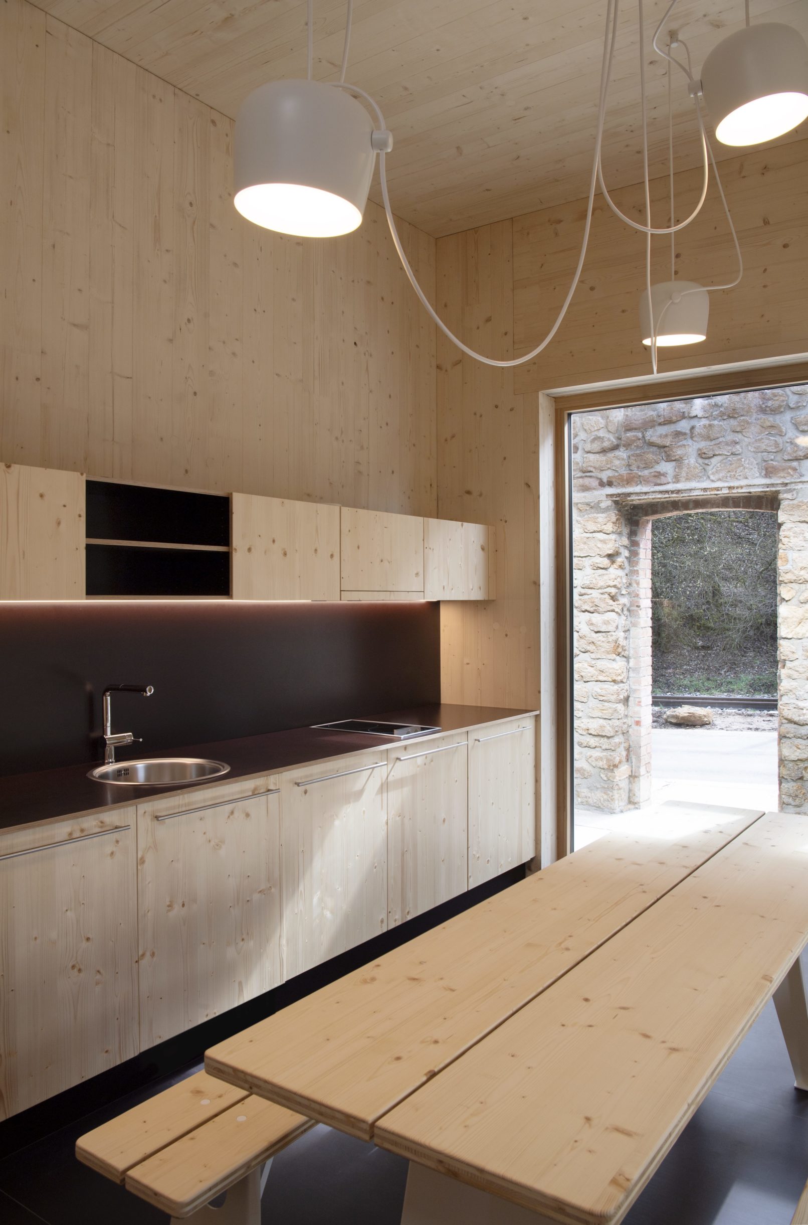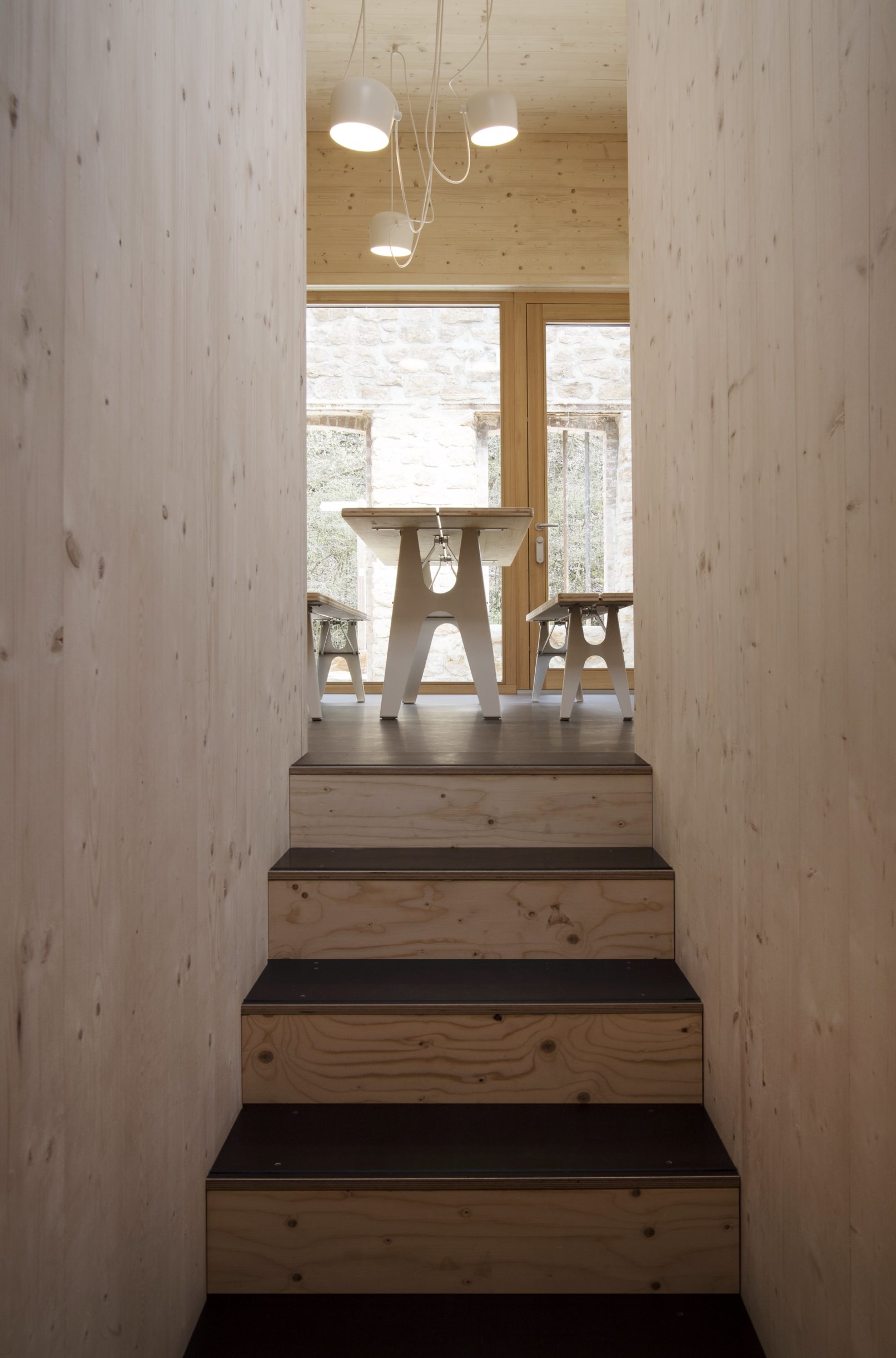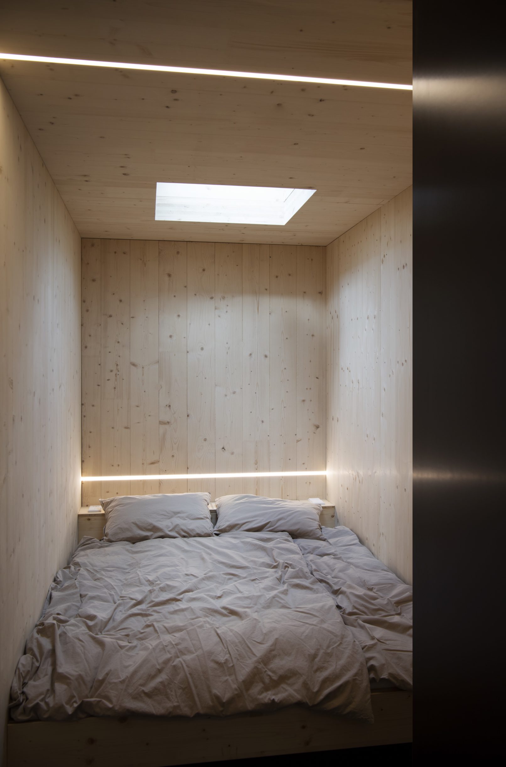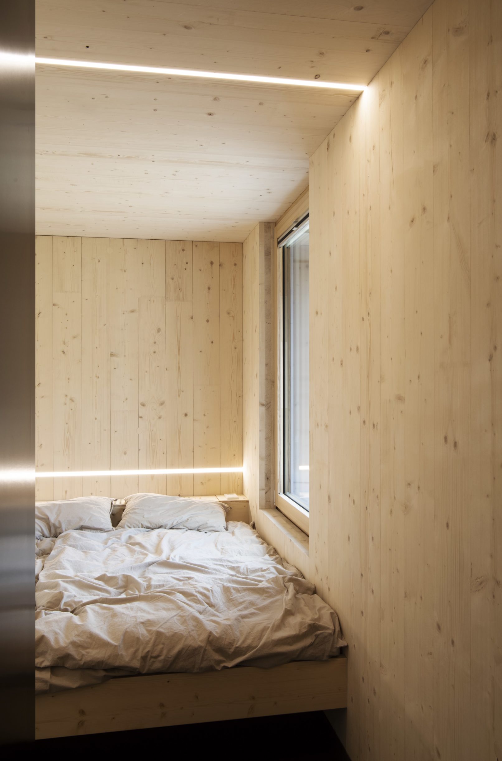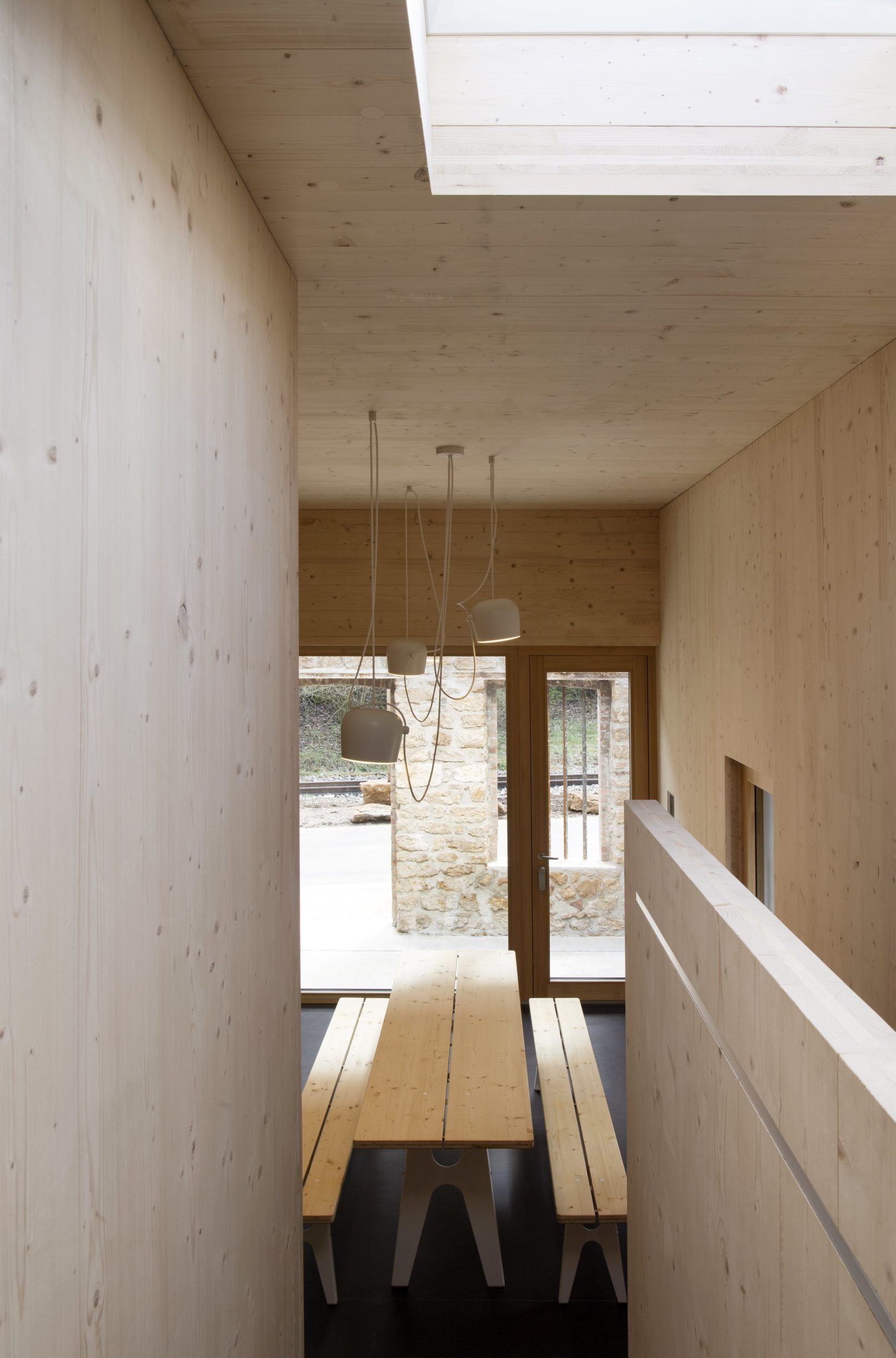 après cette étape cruciale, les travaux se sont résumés aux installations techniques ainsi qu’aux travaux de menuiserie et de mobilier intégré. à l’intérieur de la nouvelle boîte, les travaux de finitions ont été réduits au minimum en laissant le bois largement apparent. un autre grand défi a également été l’obtention des différents raccordements techniques dans les délais impartis.