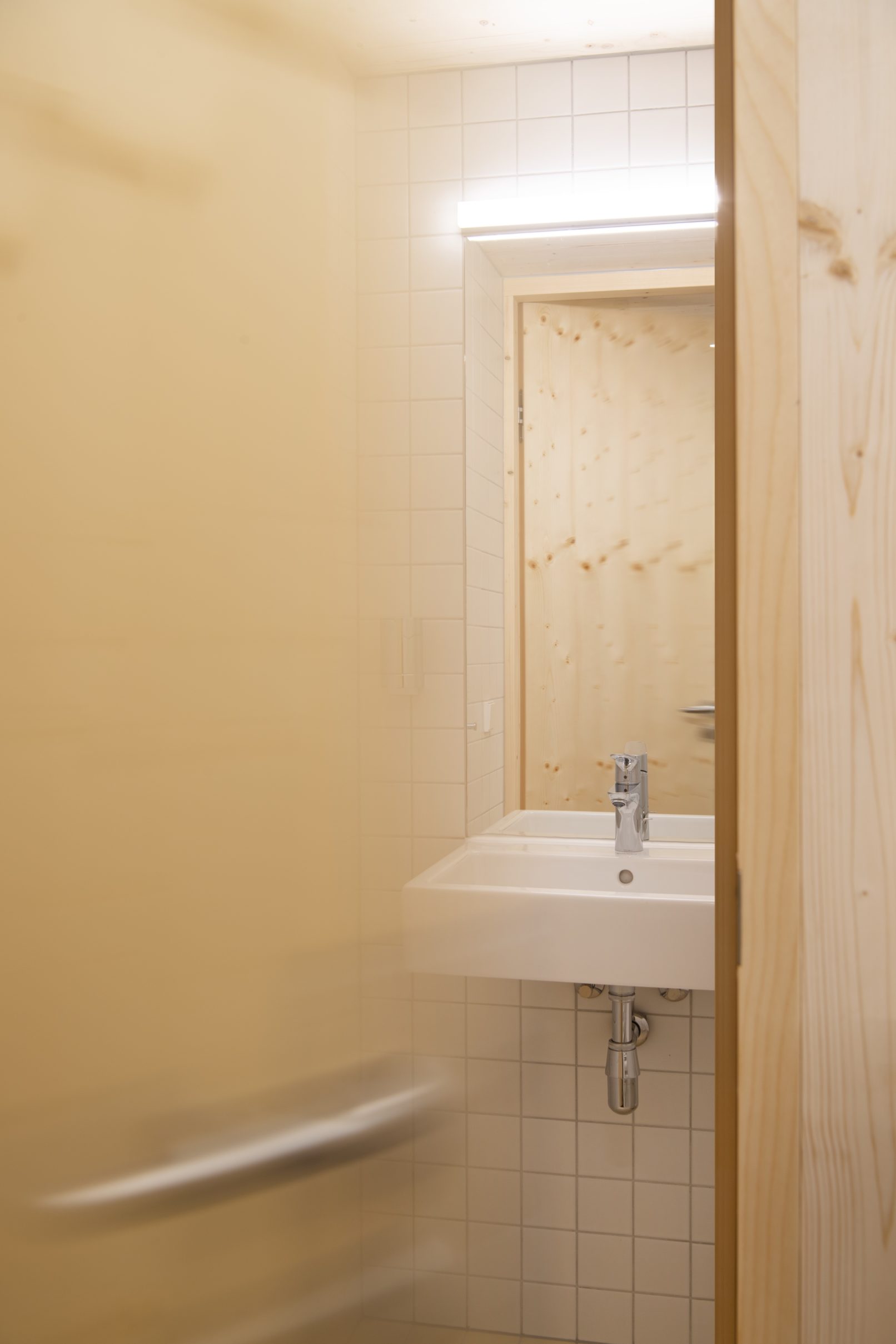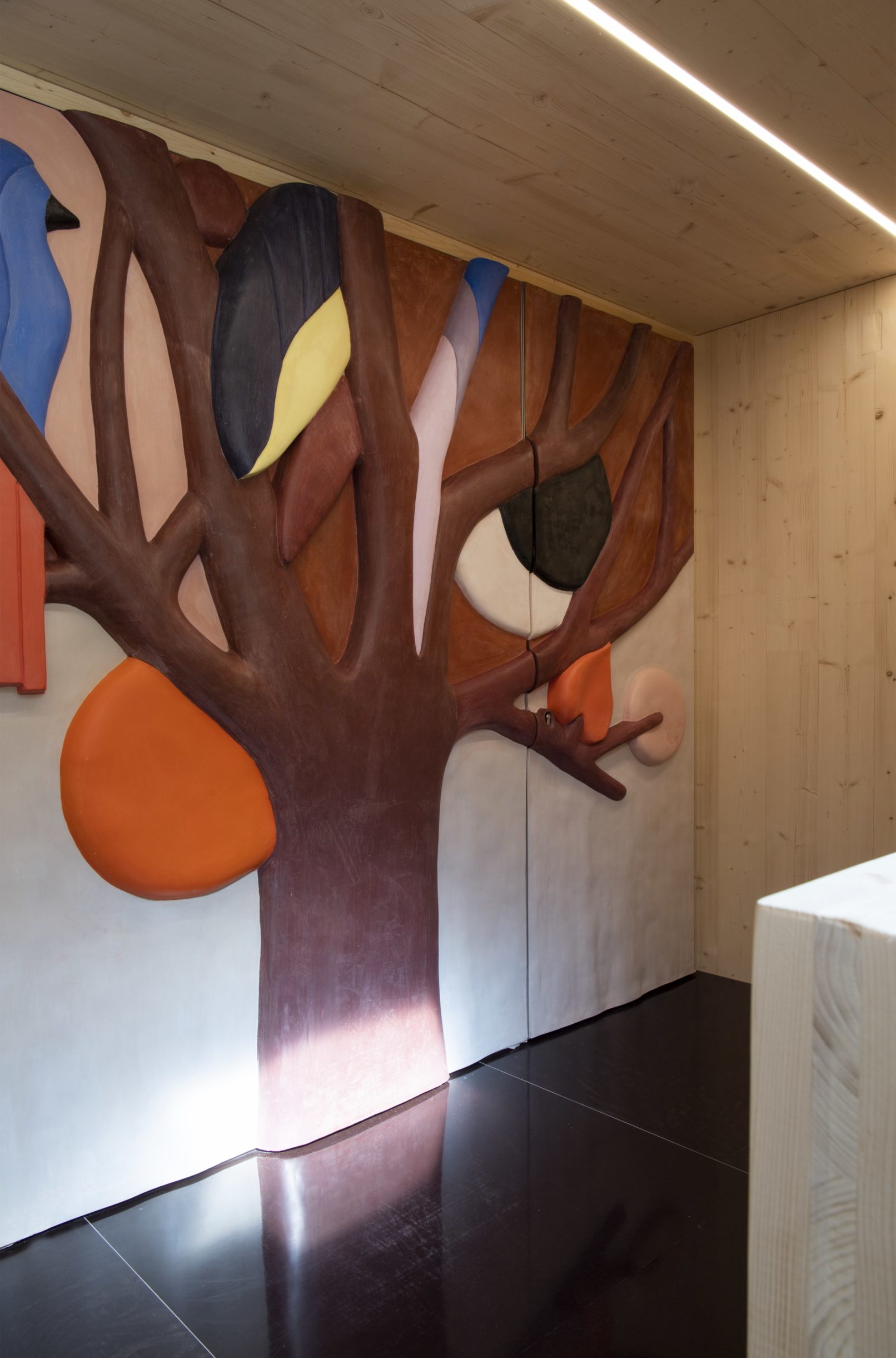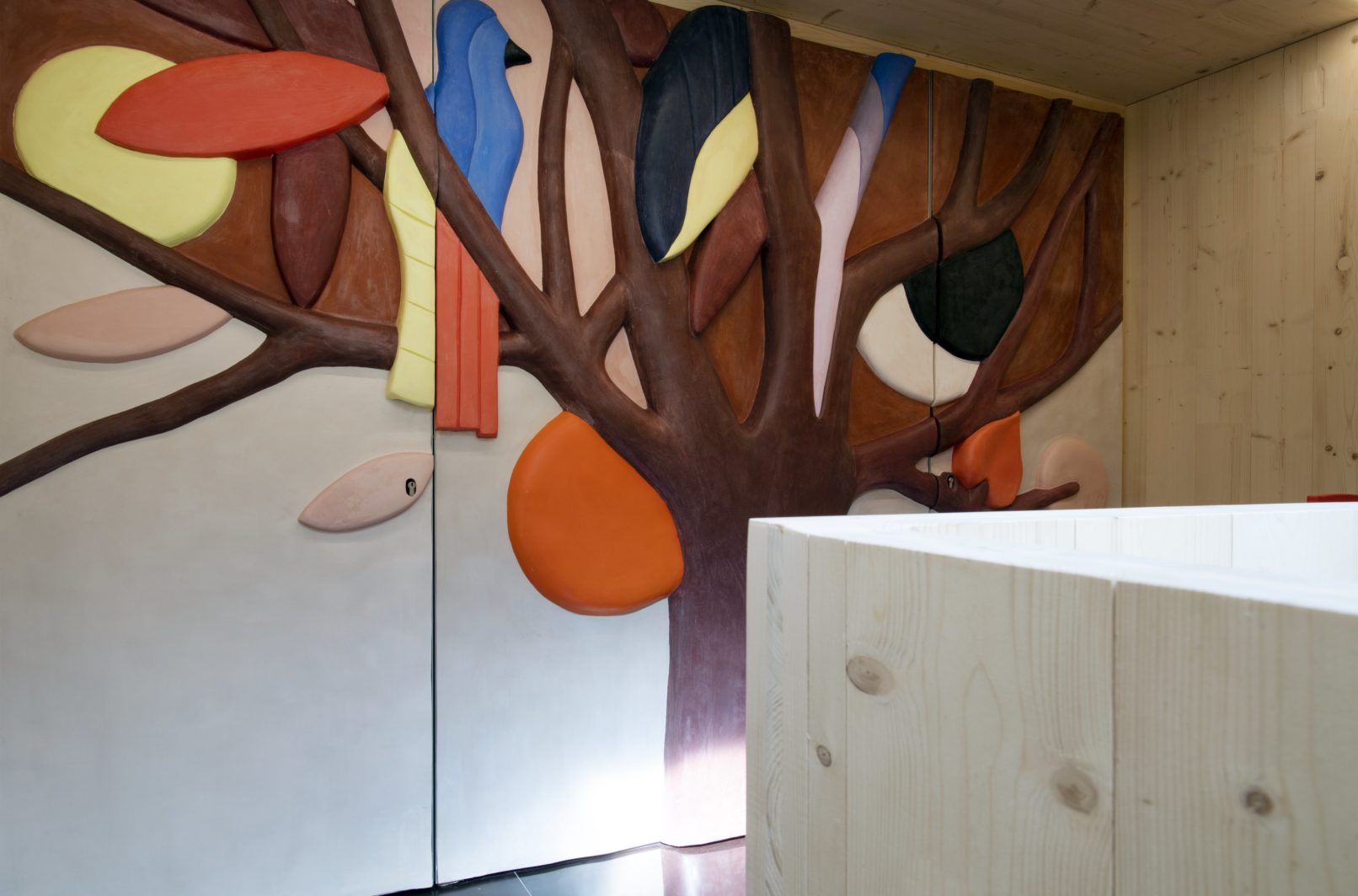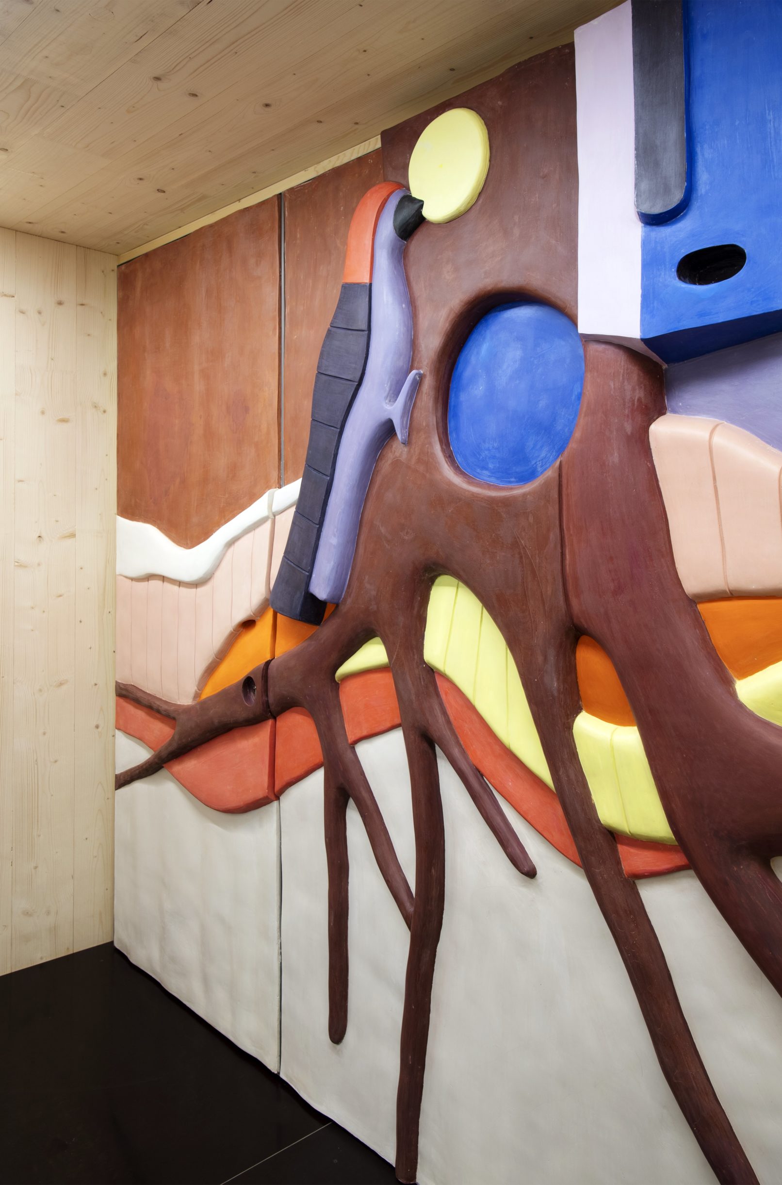 l’espace intérieur intègre un bas-relief conçu par les artistes feipel et bechameil, mis en œuvre sur l’entièreté des portes et de la cloison séparant les 4 cabines des espaces communs. cette œuvre constitue la pièce-maîtresse qui vient agrémenter cet écrin dominé par les surfaces en bois d’épicéa.