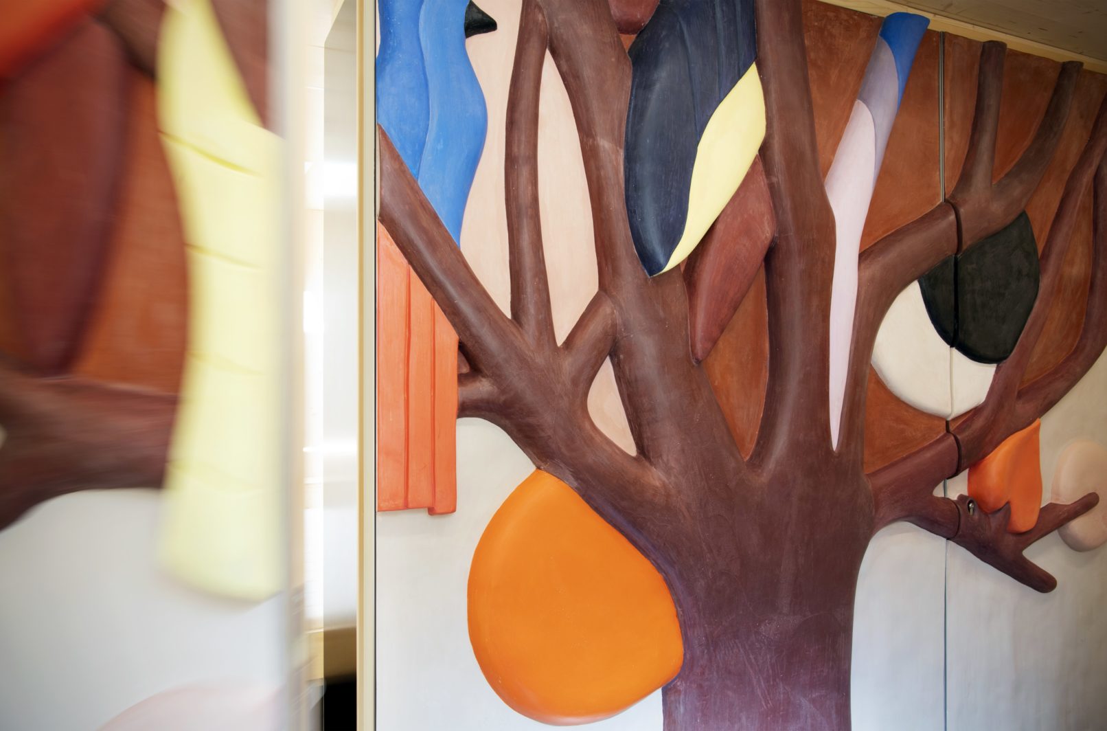 l’espace intérieur intègre un bas-relief conçu par les artistes feipel et bechameil, mis en œuvre sur l’entièreté des portes et de la cloison séparant les 4 cabines des espaces communs. cette œuvre constitue la pièce-maîtresse qui vient agrémenter cet écrin dominé par les surfaces en bois d’épicéa.