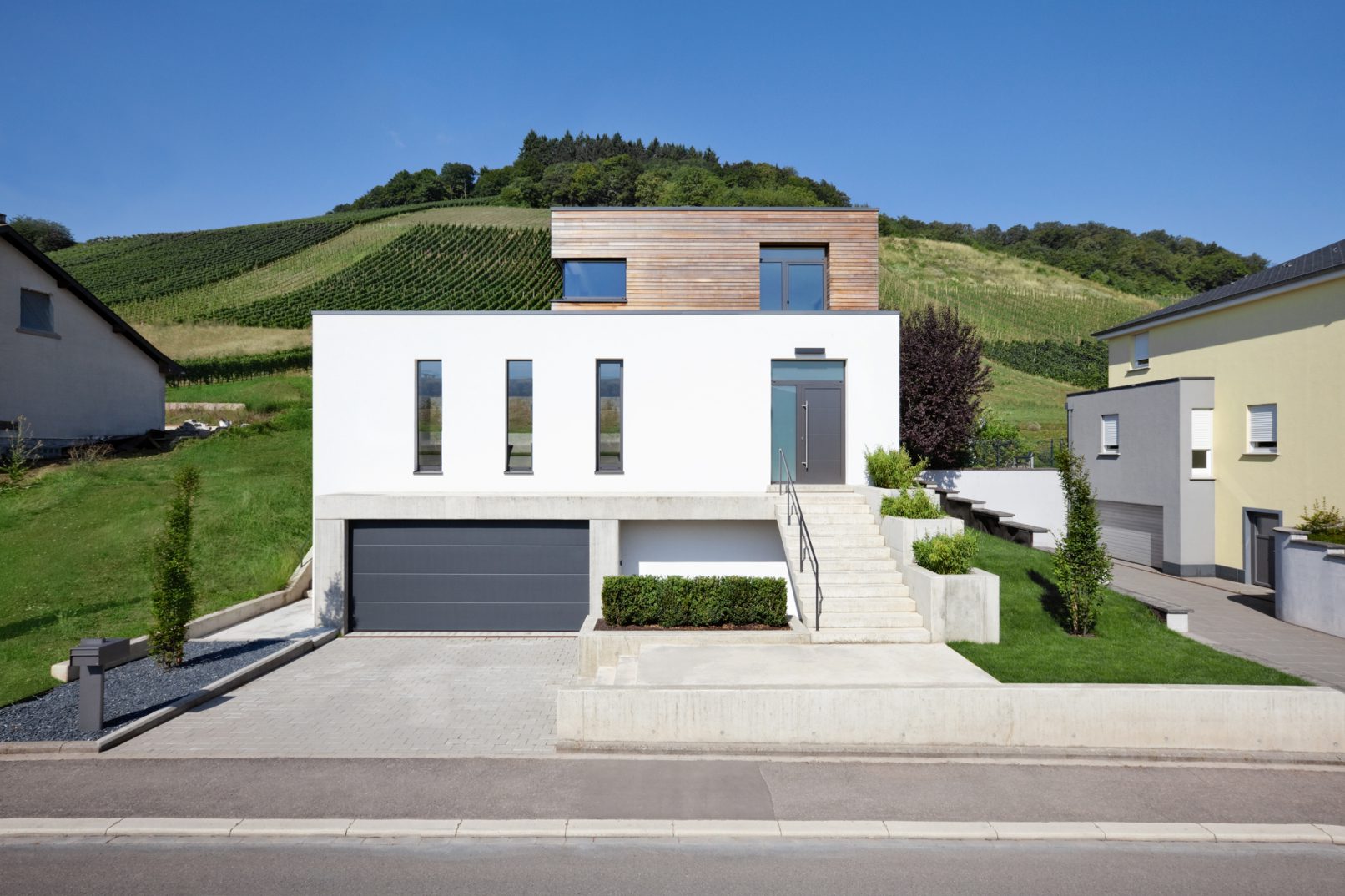 à schwebsange, au cœur des vignobles mosellans, la maison a été soigneusement intégrée au terrain assez pentu, situé entre la route principale du village et les vignes. elle est composée d’un volume en forme de l aux niveaux inférieurs et d’un volume rectangulaire au dernier niveau. ces deux volumes se distinguent clairement par la matérialité de leur enveloppe: enduit minéral en partie basse et bardage en bois en partie haute. la façade avant est relativement fermée, tandis que les façades arrières s’ouvrent généreusement sur une terrasse, générée par la volumétrie de la construction, et le jardin avec vue sur les vignobles.