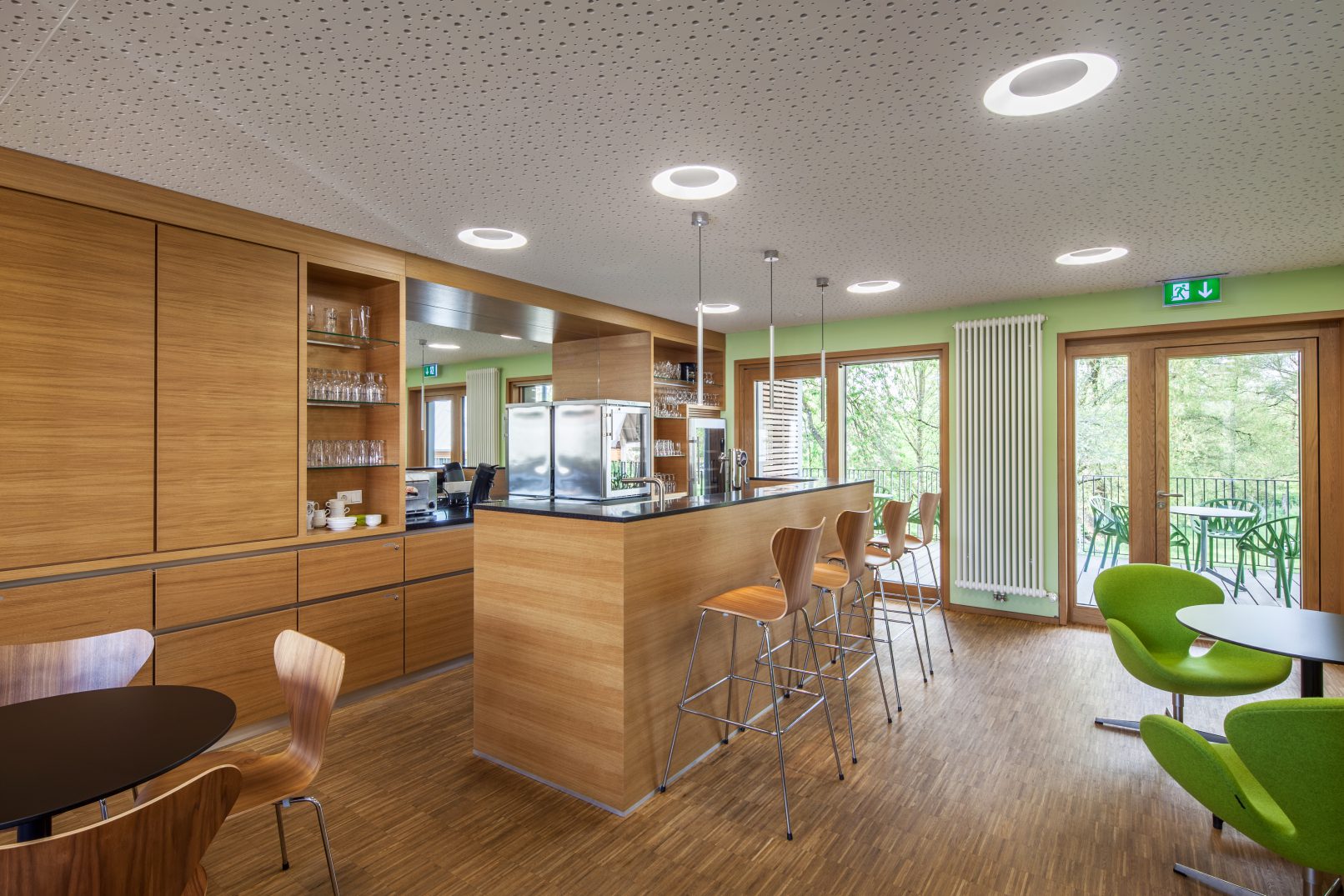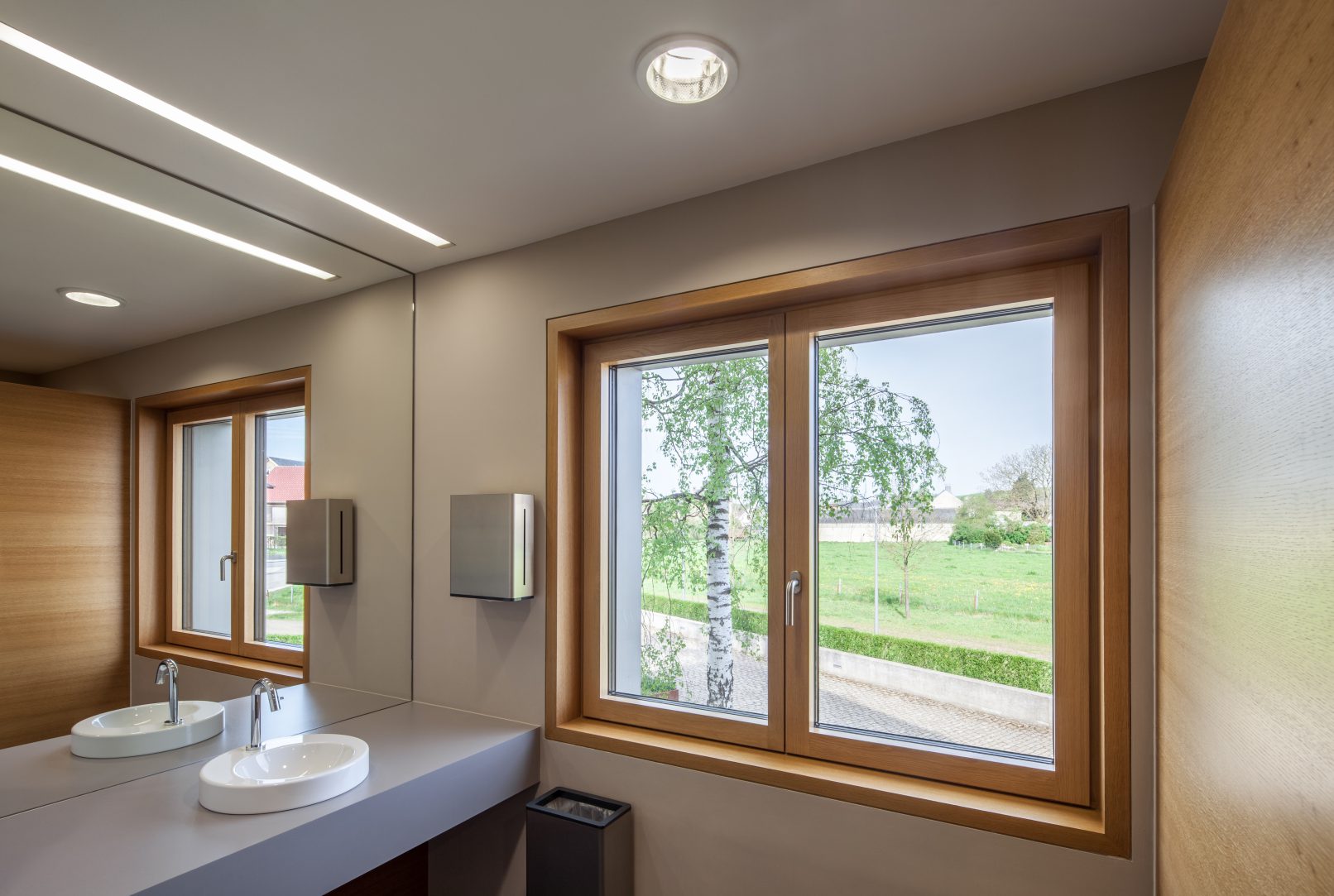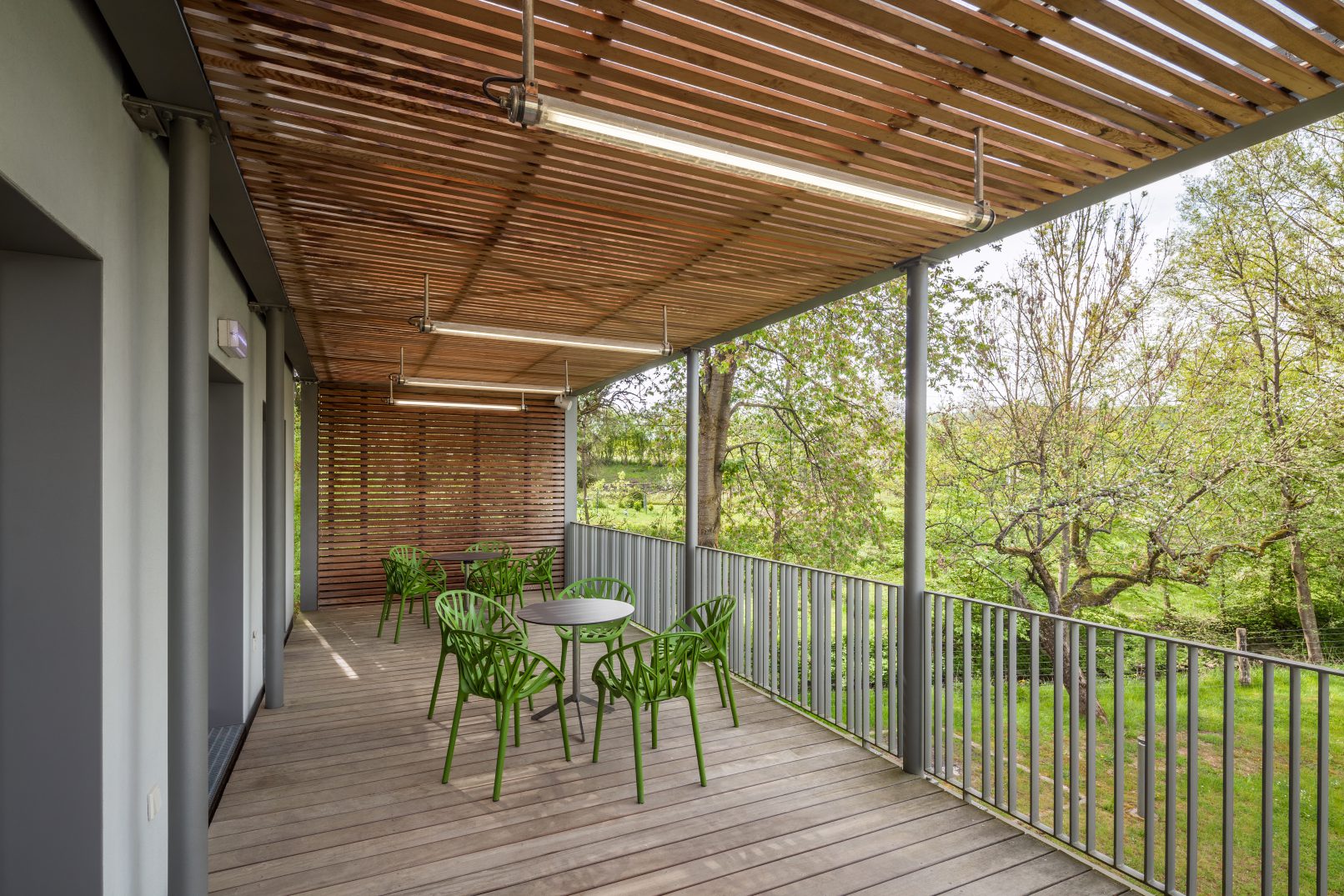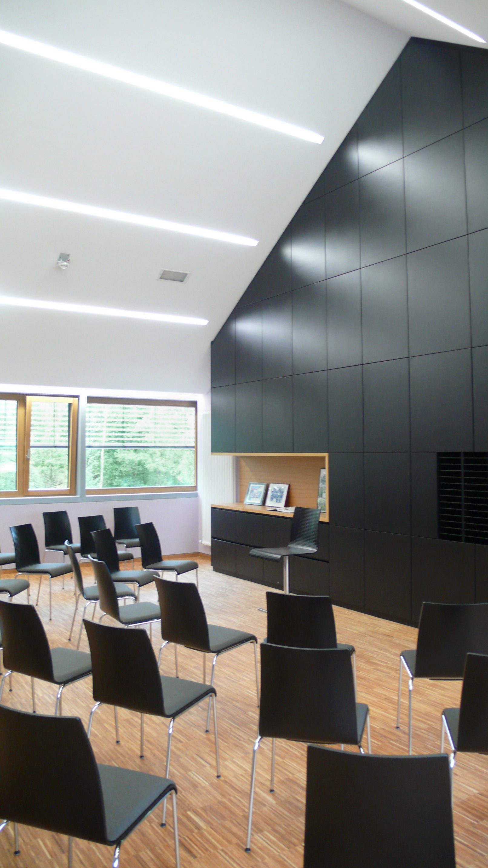 la végétation existante est conservée et complétée par de nouveaux arbres sur le parking. ce dernier est réalisé en graviers stabilisés, engazonnés afin de répondre au souhait de réduire au minimum la partie asphalteuse de l’aménagement extérieur. tout le site est mis en lumière par un éclairage led. le jardin derrière la maison pourra maintenant accueillir les fêtes organisées par les différentes associations.