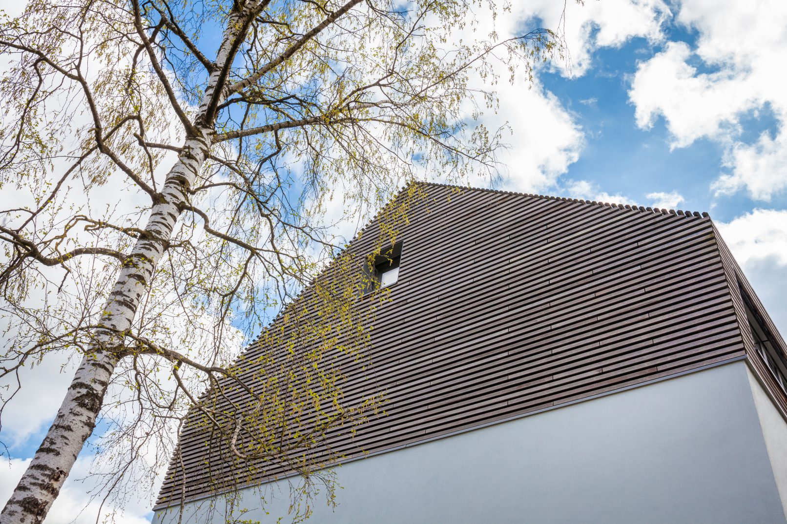 afin de pouvoir loger l’intégralité du programme, la maison a été réhaussée. l’ensemble de la construction est enveloppé d’une nouvelle isolation thermique, puis crépi sur les deux premiers niveaux et recouvert d’un bardage en bois sur le dernier niveau et la toiture, ne formant plus qu’un. l’intervention se distingue donc de la volumétrie initiale de la bâtisse.