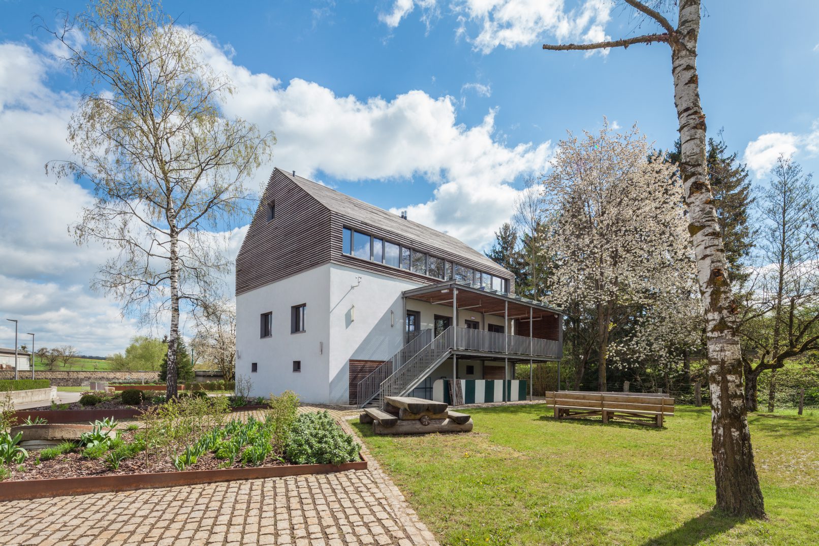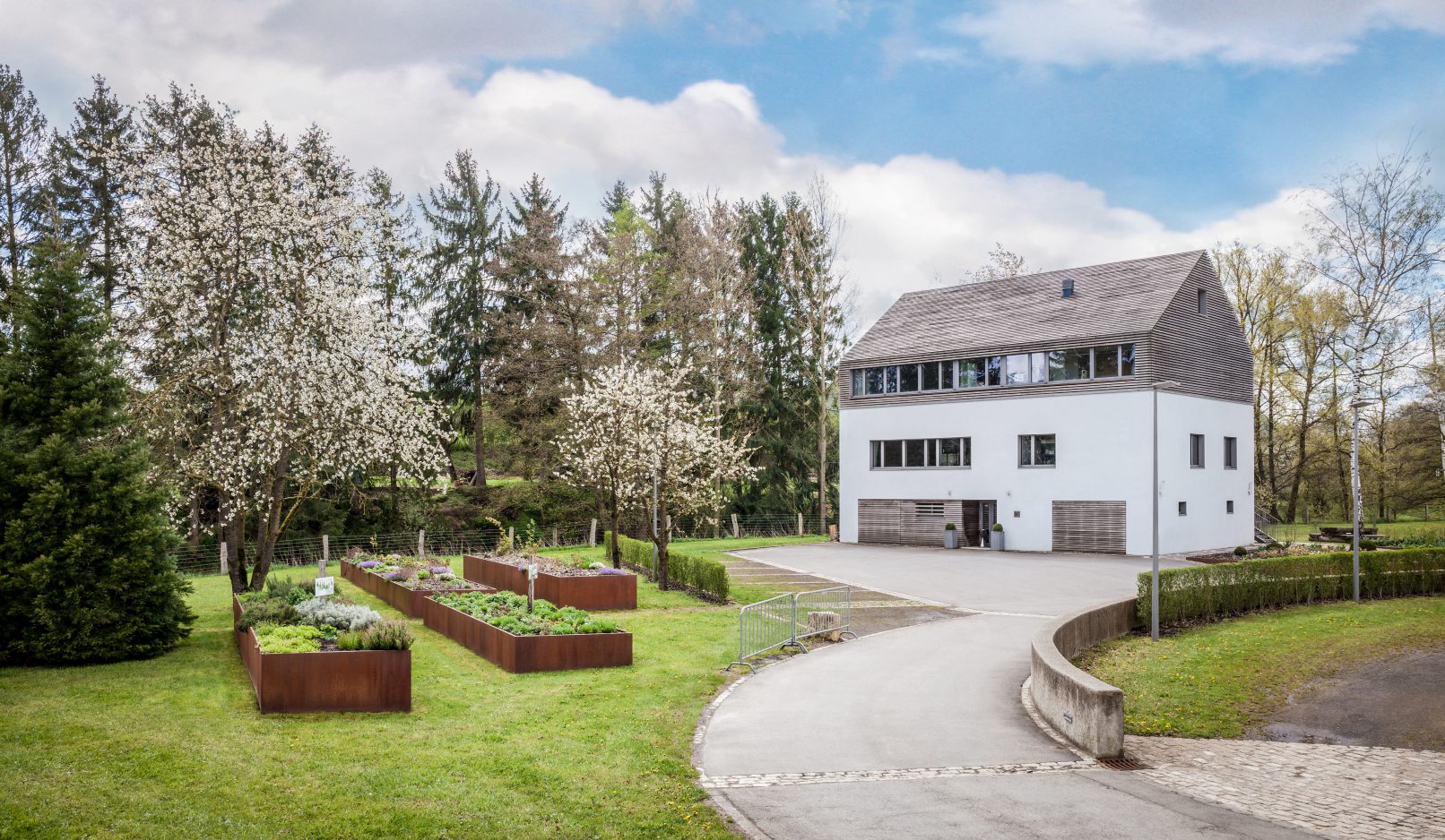 une surface longeant la syre et la roudemerbaach est gardée comme surface de renaturation. un jardin didactique accessible aux citoyens a été aménagé devant l‘immeuble avec des billons de potagers surélevés.