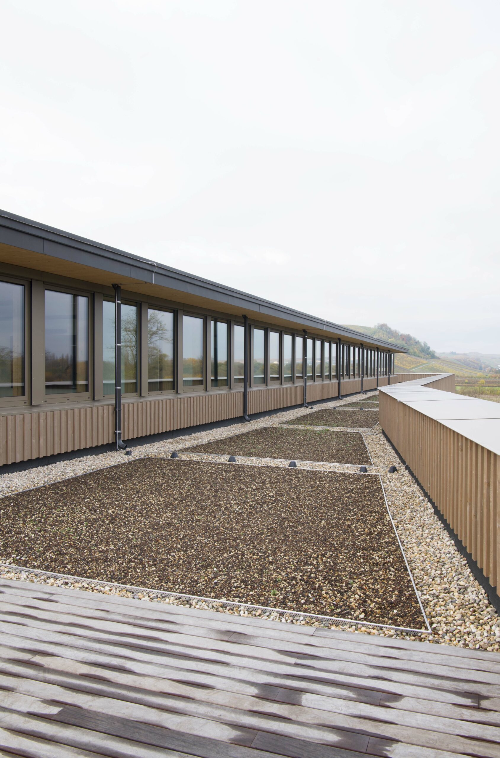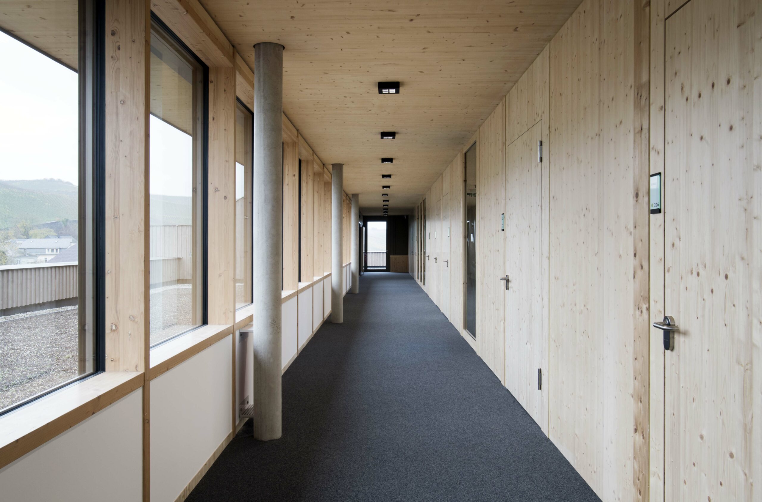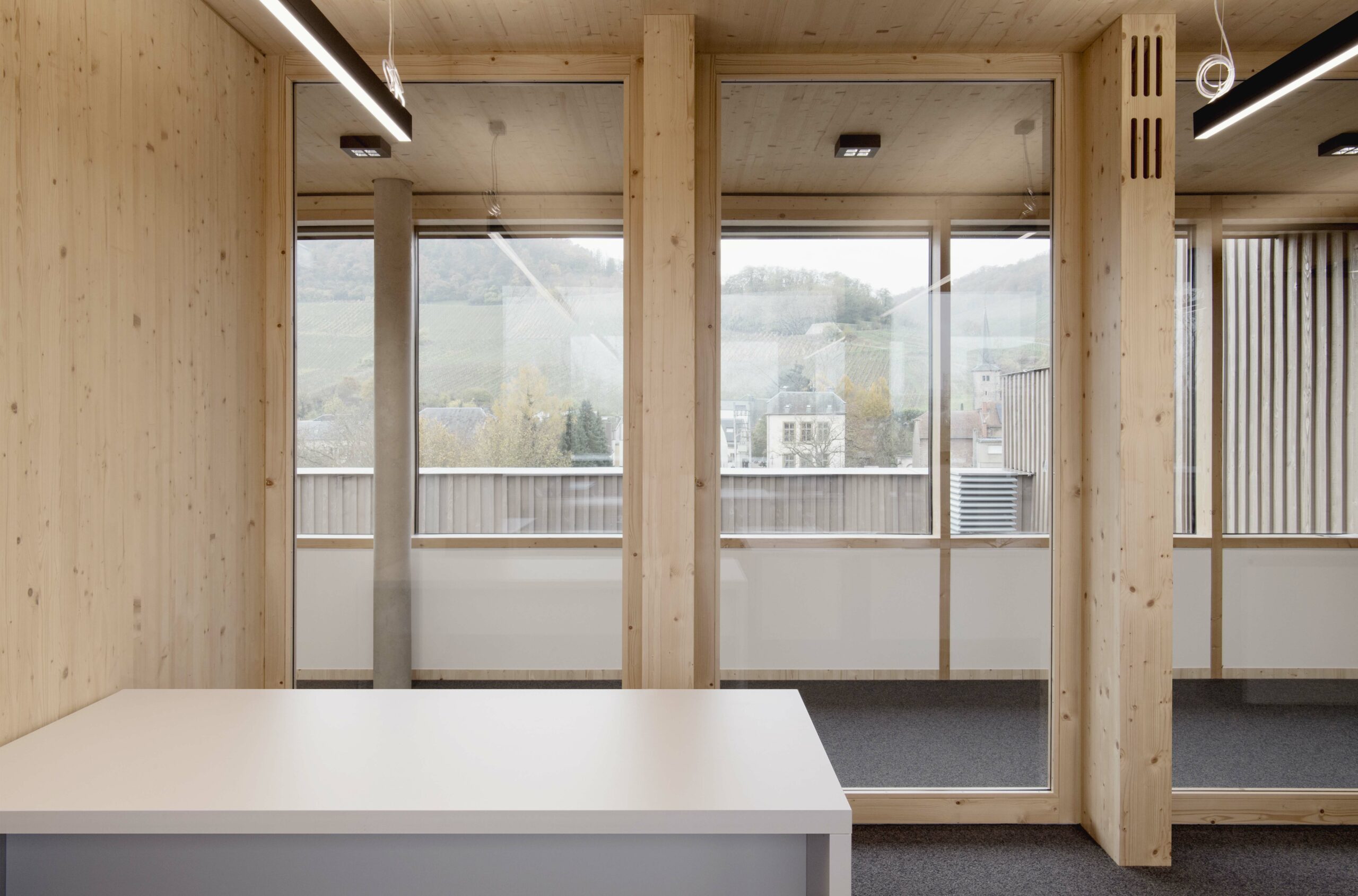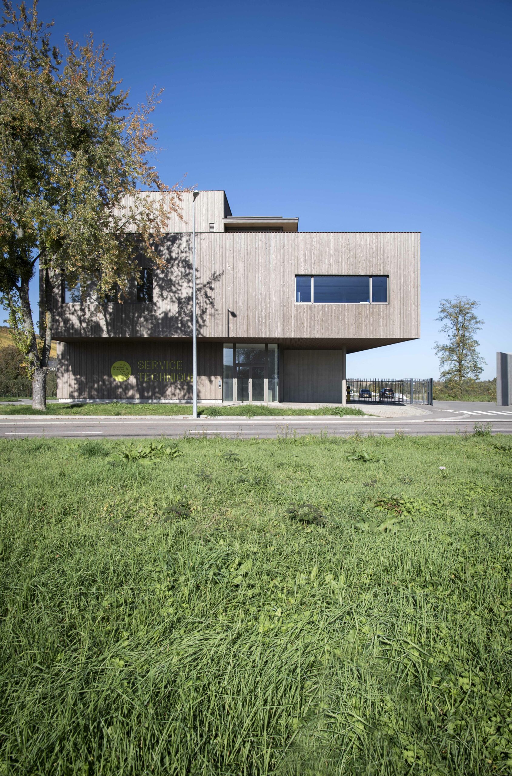 la structure portante est réalisée en béton armé, préfabriqué ou coulé sur place. le niveau inférieur présente un béton apparent, tandis que la partie supérieure est habillée d’un bardage en bois vertical. la toiture plate est en grande partie végétalisée, contribuant à l’intégration paysagère et à la performance environnementale du bâtiment. en cours de chantier, le maître d’ouvrage a décidé d’ajouter un étage supplémentaire afin d’y intégrer les nouveaux locaux du service technique communal. ce dernier niveau accueille les bureaux, salles de réunion et archives. la surélévation repose sur une structure en bois, choisie pour sa légèreté, ses qualités écologiques et son rendu esthétique. les façades de cet étage reprennent le bardage en bois du niveau inférieur et sont largement vitrées, offrant une lumière naturelle généreuse et des vues sur le paysage de la vallée de la moselle.