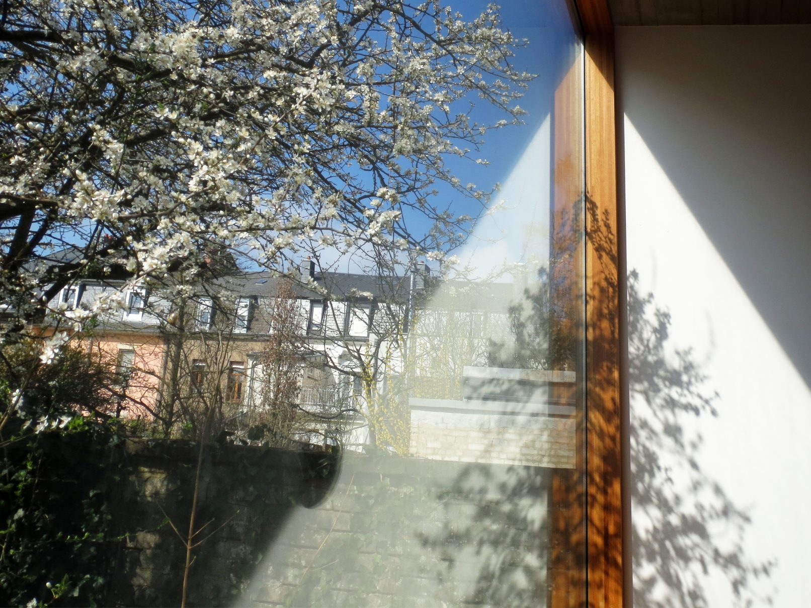 la maison étant située dans un ensemble sensible de la ville de luxembourg, la façade avant a été maintenue et restaurée. les châssis des fenêtres en bois ont été reproduits à l’identique, tout en les équipant de double vitrage isolant. à contrario la façade arrière a été entièrement reconstruite, intégrant une extension de l’espace habitable au niveau du rez-de-chaussée.