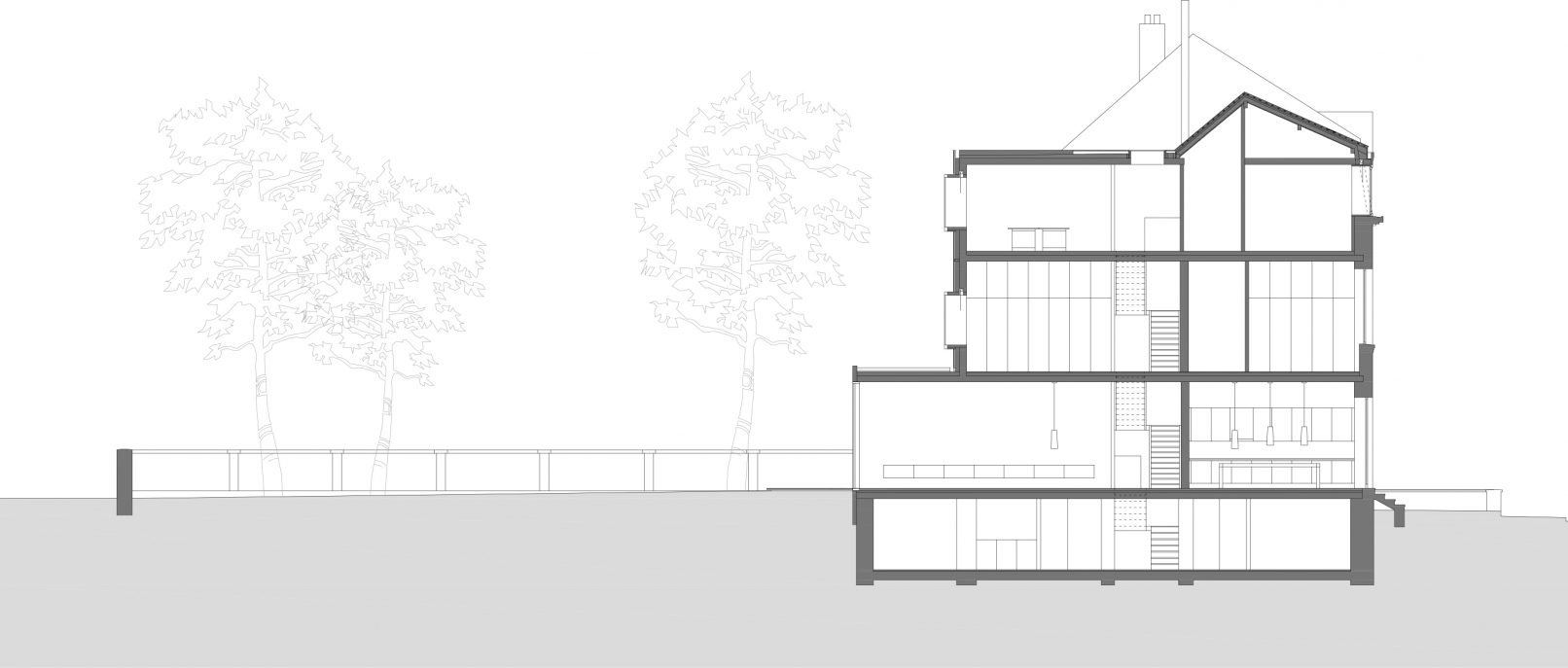 la maison d’habitation datant de 1911 a été transformée et agrandie se basant sur un concept de loft vertical sur trois niveaux. ainsi l’ensemble de la maison est constitué d’un seul espace, modulable uniquement par des portes coulissantes ou pivotantes.